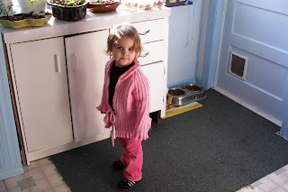 This is a sweater I knit for a friend's daughter. The longhaired little girl is on the front of the Mary Maxim pattern, and the little girl standing in front of the white cupboard is wearing the sweater I knit. As a side note, I dislike Mary Maxim patterns (poorly written) and really hate knitti